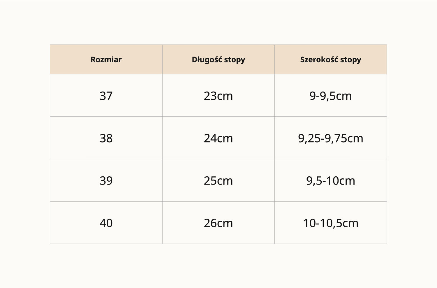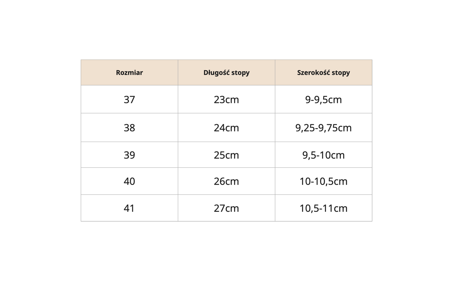 Aby upewnić się, że zamówisz prawidłowy rozmiar, zmierz stopy i porównaj wyniki z poniższą tabelą rozmiarów. To najlepszy sposób, aby znaleźć odpowiednie dopasowanie.