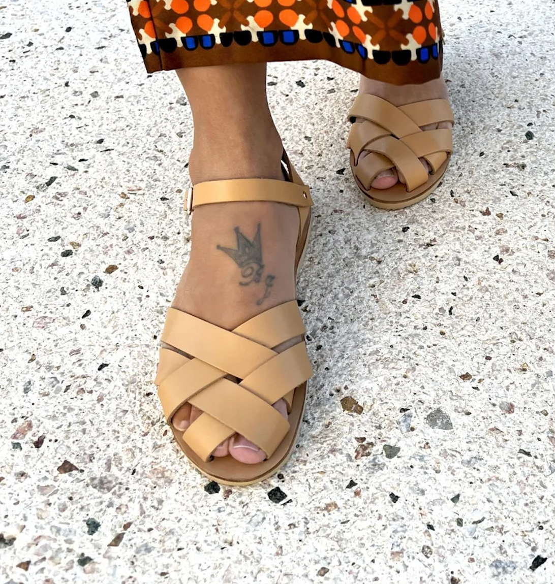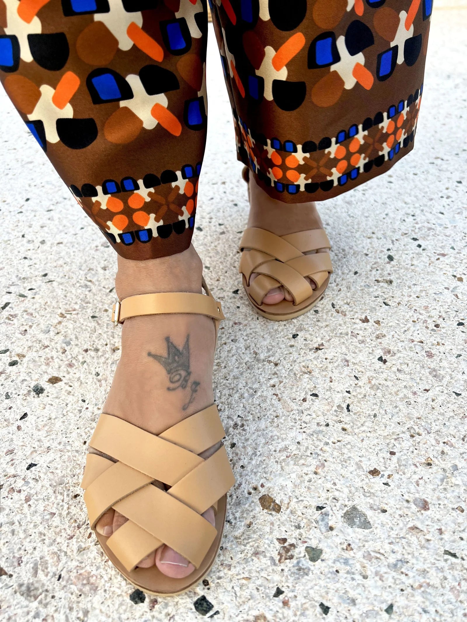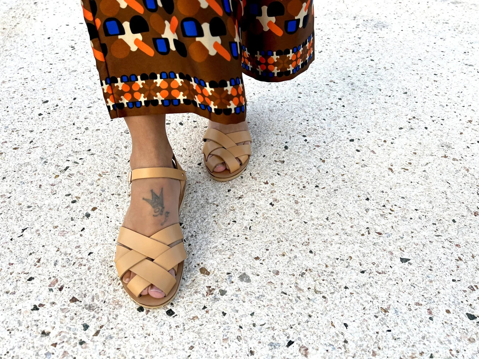 Ręcznie robione skórzane sandały z paskiem wokół kostki.