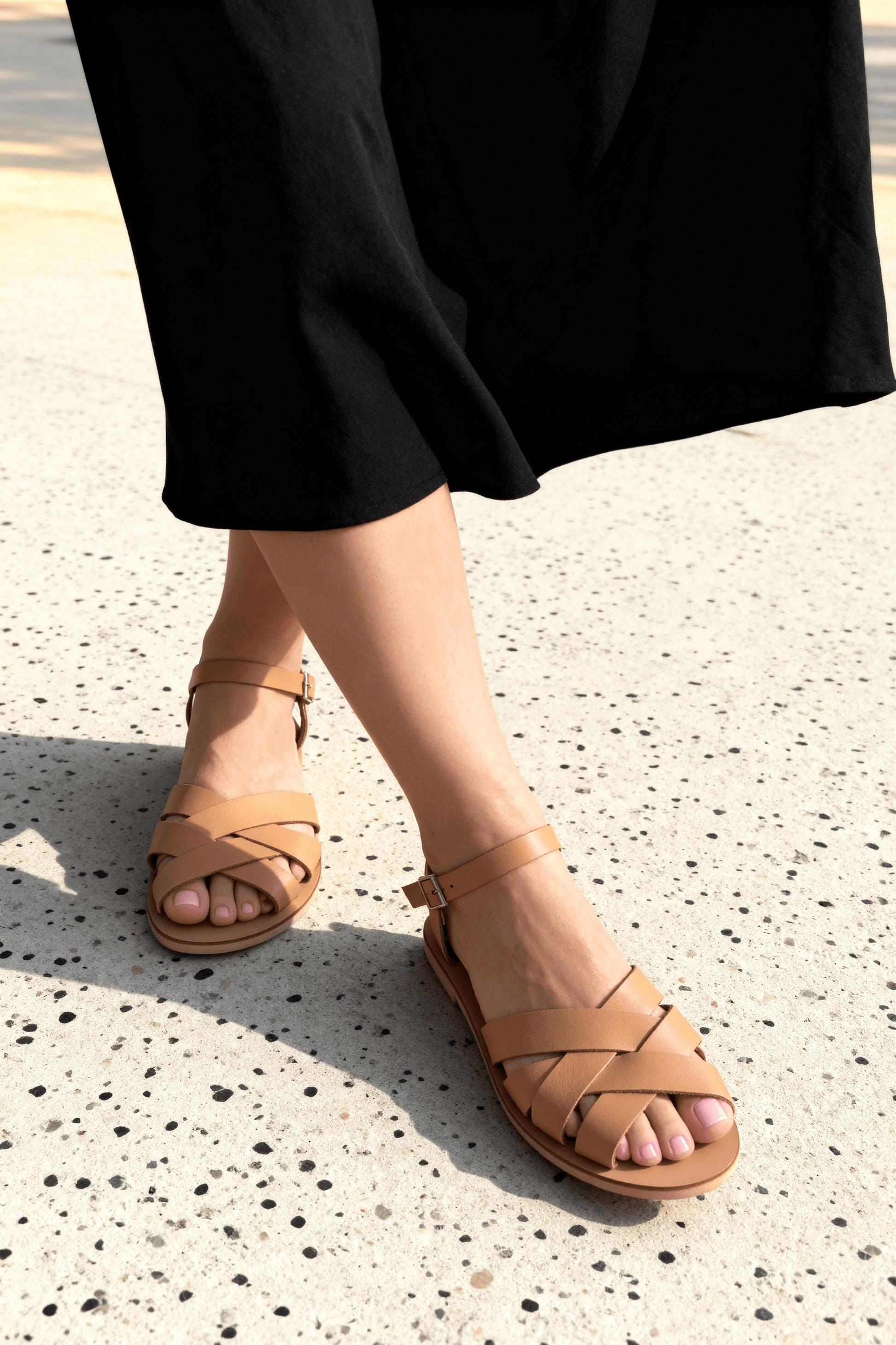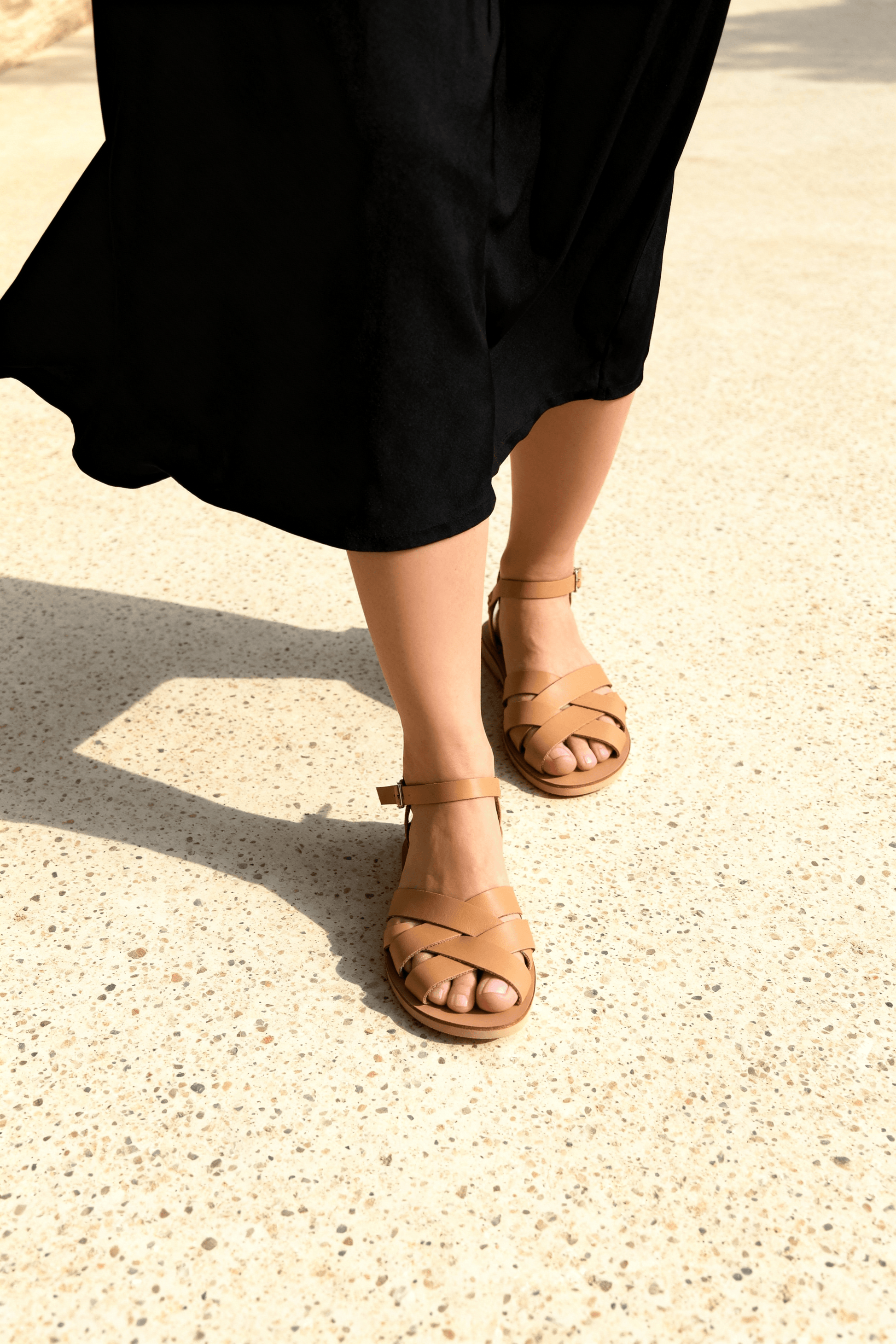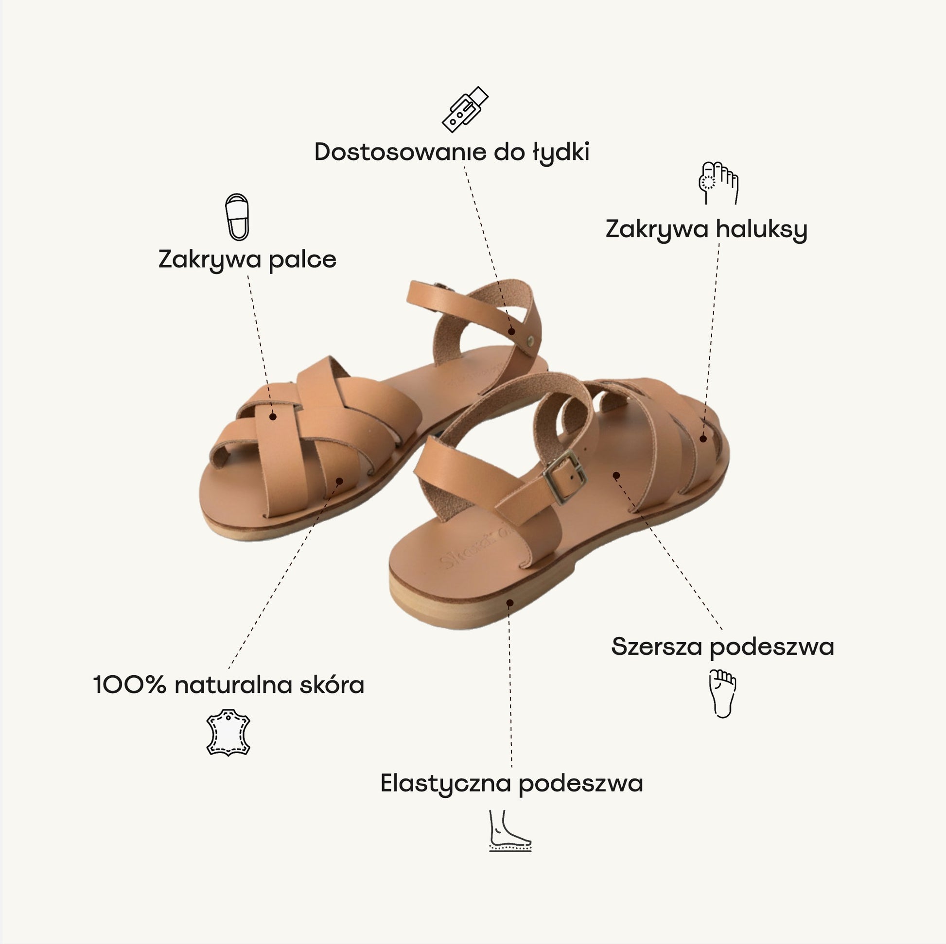 Sandały z naturalnej skóry zapewniają wygodę dzięki elastycznej i szerszej podeszwie, dostosowanej do tężyzny stopy. Zakrywają palce i haluksy, chroniąc newralgiczne miejsca podczas codziennego noszenia.
